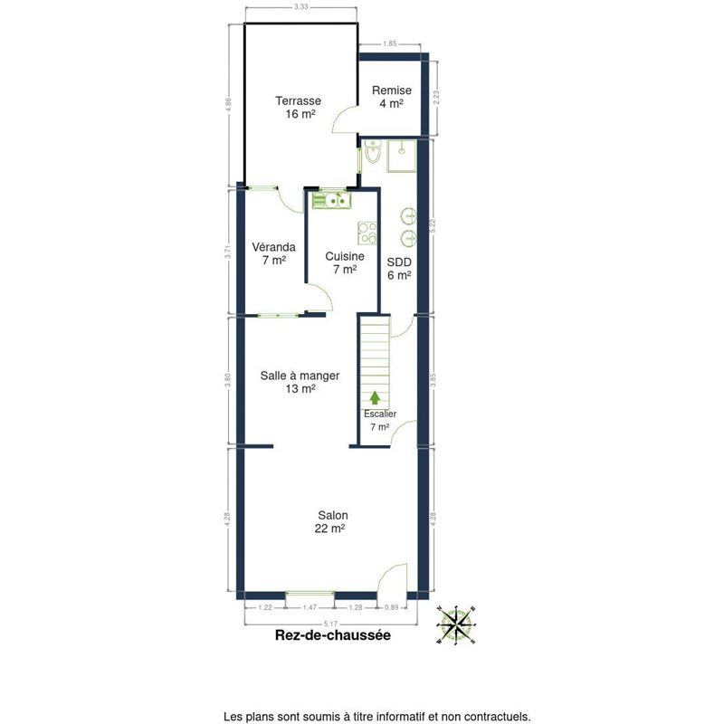 RDC : spacieux séjour de ± 32 m² avec en enfilade une cuisine équipée de ± 7 m², salle de douche (meuble lavabo, cabine de douche et toilette) et une véranda donnant accès à l’extérieur.