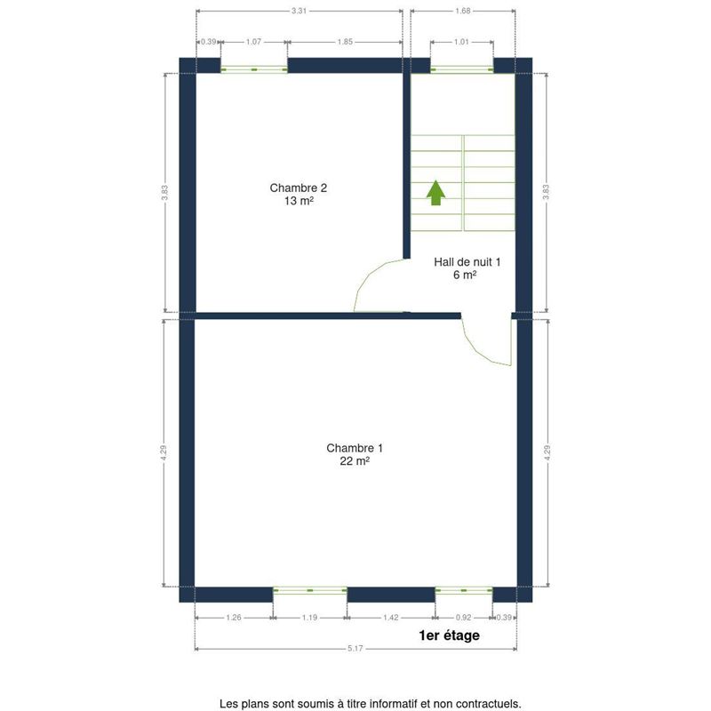 Le premier niveau dessert deux belles chambres de ± 22 m² et ± 12 m² via un palier de distribution.