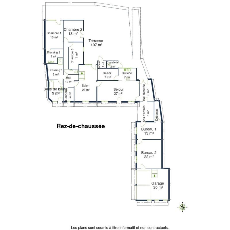 Le rez-de-chaussée se compose d’un hall d’entrée, d’un spacieux séjour lumineux, d’une cuisine équipée avec cellier, d’un second salon, d’une buanderie, salle de bain, salle de douche, wc, ainsi que deux chambres (+/- 15 m² et +/- 14 m²) et d’un espace dressing (+/- 10 m²).